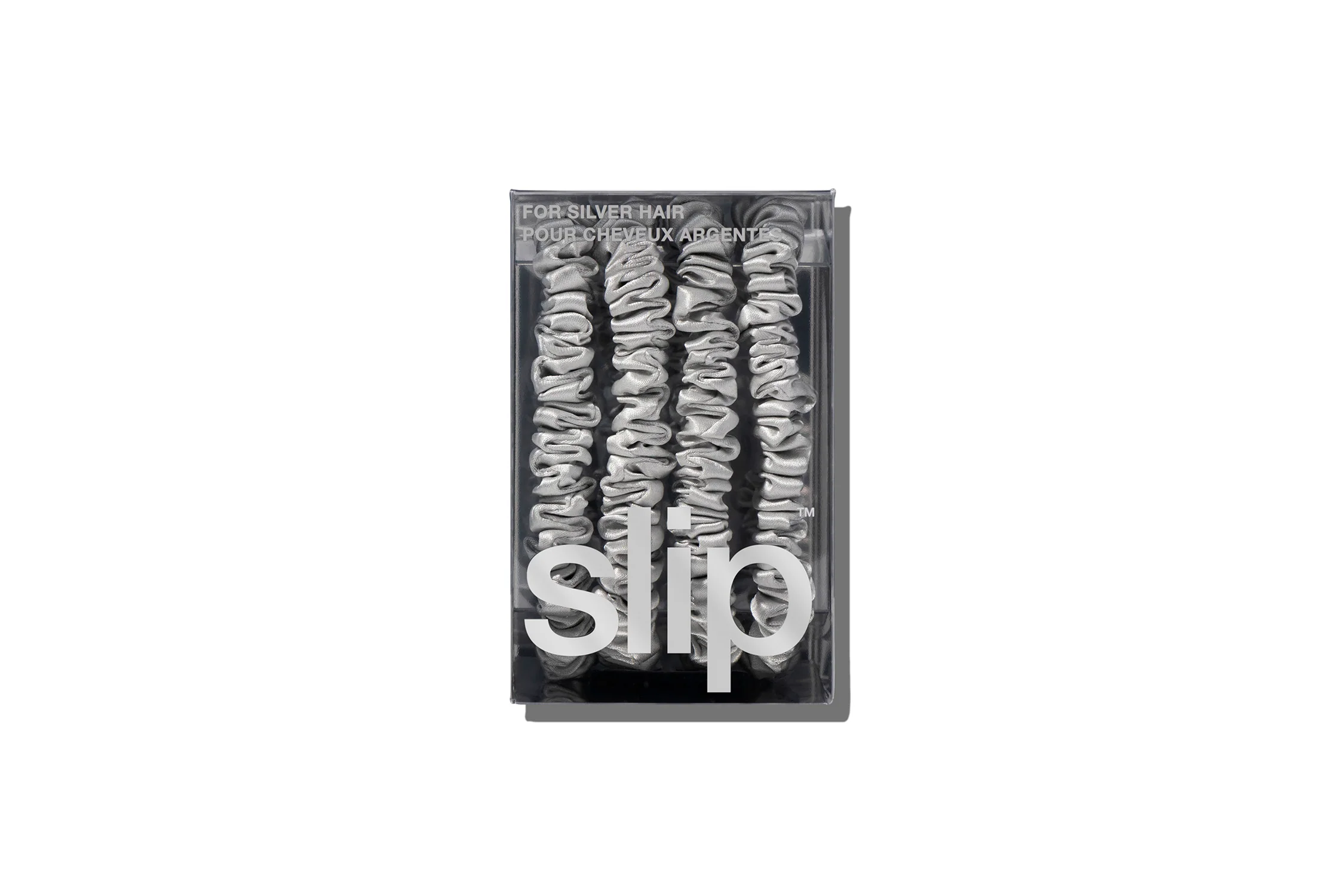This set includes: 4 x multi award-winning silver pure silk skinny scrunchies